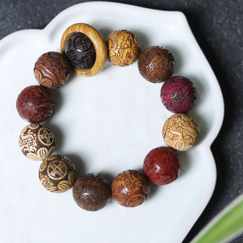 Satori Totem Carving Sandalwood Chinese Zodiac Auspicious Dragon Phoenix Fu Character Healing Bracelet